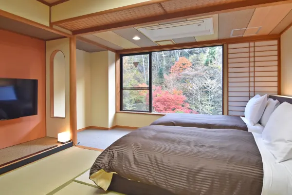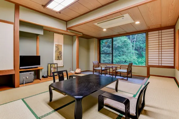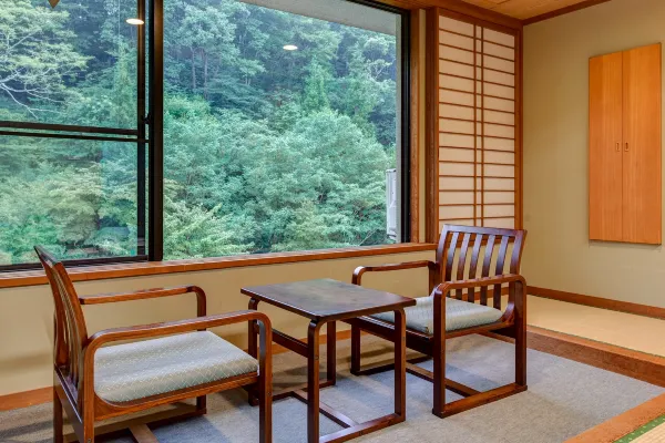 The source of the hot spring at Nekotaki Onsen Shikibu no Yakata Izutsuya is an alkaline simple weak radioactive cold mineral spring, which is rare in Japan. Please relax and enjoy the scenery of the four seasons. There are 16 Japanese-style rooms in the main building (with bath and heated toilet seat). The Japanese-Western style rooms in the main building are Japanese-Western style rooms with beds placed on tatami mats.