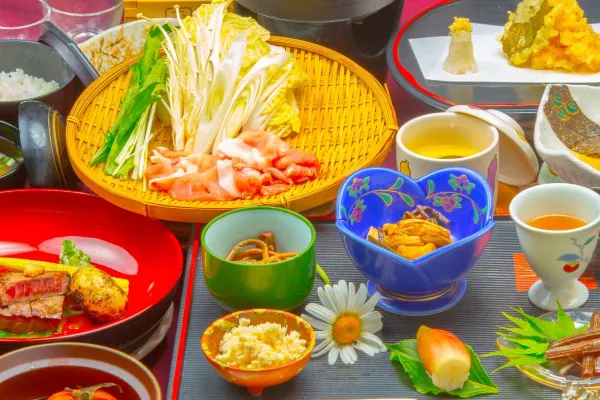 Our kaiseki cuisine, unique to a mountain inn, abundantly features mountain delicacies, including seasonal wild vegetables. River fish and meat dishes are also served, making for hearty portions. Our steaming hot rice, with its beautiful glossy sheen, is made from our own homegrown rice. We cultivate our rice ourselves because we want you to experience its true flavor. The ingredients used in our dishes are organic rice and organic vegetables. We hope you can enjoy safe, wholesome food with peace of mind. Our homegrown rice, “Autumn Landscape,” cultivated by harnessing the day-night temperature difference, boasts a rich aroma and satisfying stickiness. You can also savor mountain trout (sea bream during New Year) and Kumamoto’s famous horse sashimi.