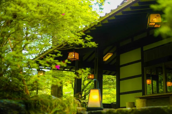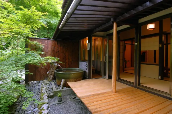 At Momijiya Annex Kawa no Iori, you can fully savor the elegance of the four seasons: spring cherry blossoms, autumn foliage, winter’s silver world of Kitayama cedar forests, and summer evenings watching Genji fireflies dance over the clear waters of the Kiyotaki River. Another major attraction is enjoying summer riverbed dining while watching maiko perform Kyoto dances. Baths: Overlooking the majestic nature of Takao