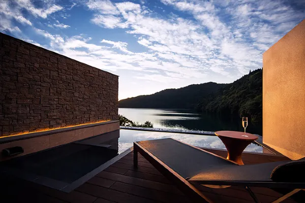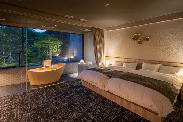 Nestled on the shores of Oshidori Pond, Azuma-en offers lavish guest rooms and direct-flow hot spring baths with views as beautiful as a Japanese painting. Designed with the theme of relaxation and tranquility, every guest room—from its ambiance and furnishings to its views—is imbued with a rich Japanese aesthetic, crafted with meticulous attention to detail. All 27 rooms are designed so guests feel increasingly at ease, enjoying moments filled with deep emotion.