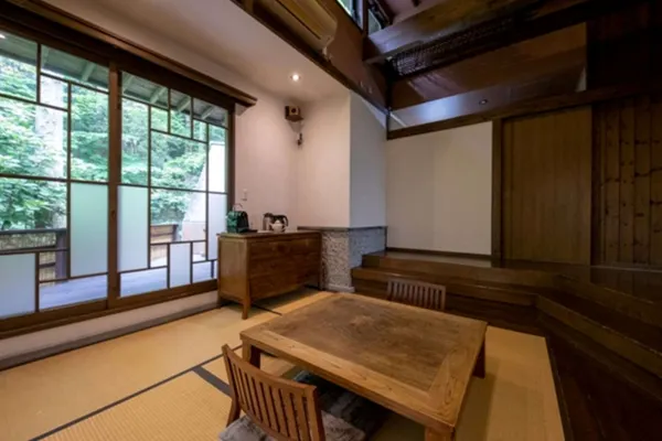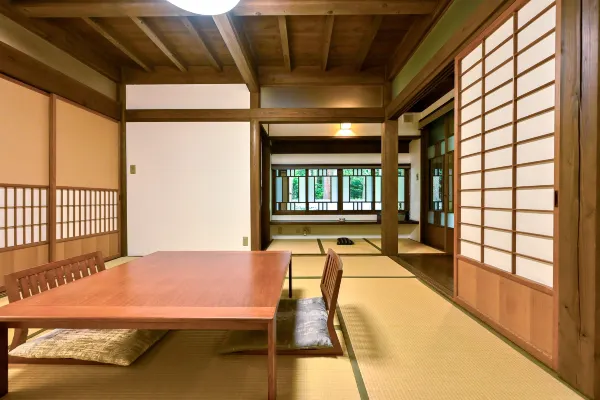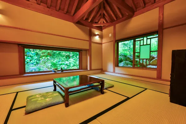 A spacious 7,600㎡ property with only ten detached cottages—each with its own private open-air bath—blending Japanese and Western design in a calm, natural setting.