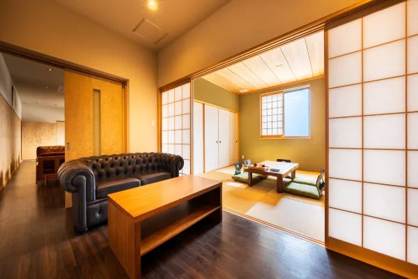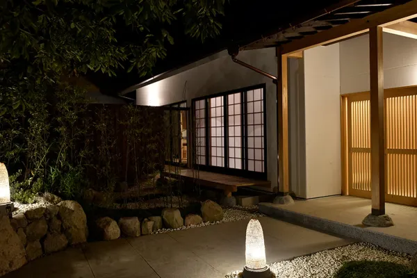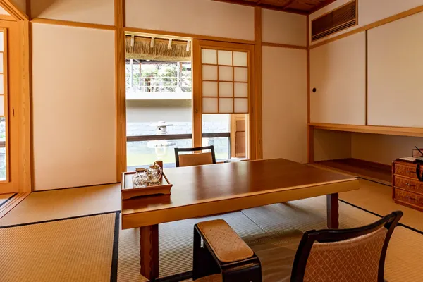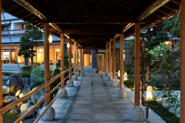 Pass through the charming gate and walk along the stone path to reach a hot spring inn where Japanese elegance and nature harmonize. Within the grounds, you will find a traditional Japanese Noh theater and a thatched-roof tea house. The garden features two ponds with a small waterfall, historical sites designated as tangible cultural properties, and stone pagodas. Step inside, and you will forget the daily clamor and surrounding bustle. Guest rooms offer either Japanese-style tatami rooms gently scented with rush grass, or rooms furnished with high-quality European furniture for rich comfort— a relaxing space that feels extraordinary yet somehow nostalgic.