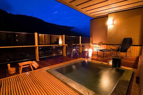Amagase Onsen is a historic hot spring discovered 1,300 years ago, mentioned in the Fudoki of Bungo Province from the Nara period, and counted among the Three Great Hot Springs of Bungo alongside Beppu and Yufuin. Located on both banks of the Kusu River, Amagase boasts such an abundant supply of hot spring water that the baths constantly overflow without any recirculation. Ukiha Annex Shin-Shiyo sits on a hilltop with a panoramic view of Amagase, beloved by guests as the “Hydrangea Inn.”